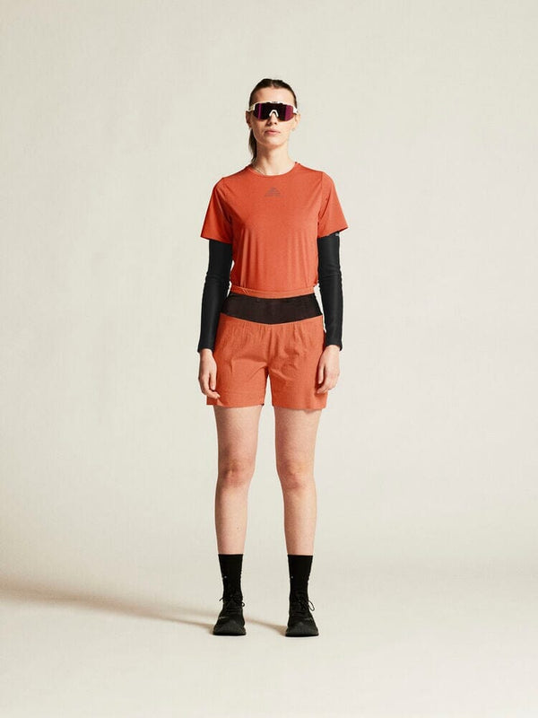 Hit the trails with comfort in the Craft Sportswear Women's Pro Trail Short Sleeve Tee 2. It's made from recycled polyester and elastane grid-jaquard jersey, making it an eco-friendly option for trail runners. Soft shell fabric at the neck hole eliminates the chances of chafing, while taped hems on the sleeves and bottom offer a polished finish. The t-shirt also comes with side slits for enhanced comfort, and a racer back cut for unrestricted motion. Lastly, a Craft trail logo on the front and six dots on the lower back add visual appeal.